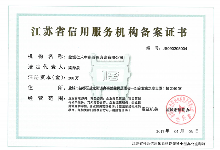 - 江蘇省信用服務(wù)機構(gòu)備案證書